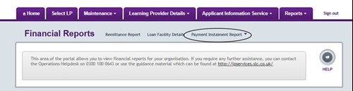 1. Hover over the Applicant Information Service tab to open the menu. Select Financials Home, then Payment Instalment Report.