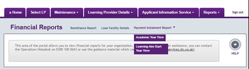 1. Hover over the Applicant Information Service tab to open the menu. Select Financials Home, then Payment Instalment Report.